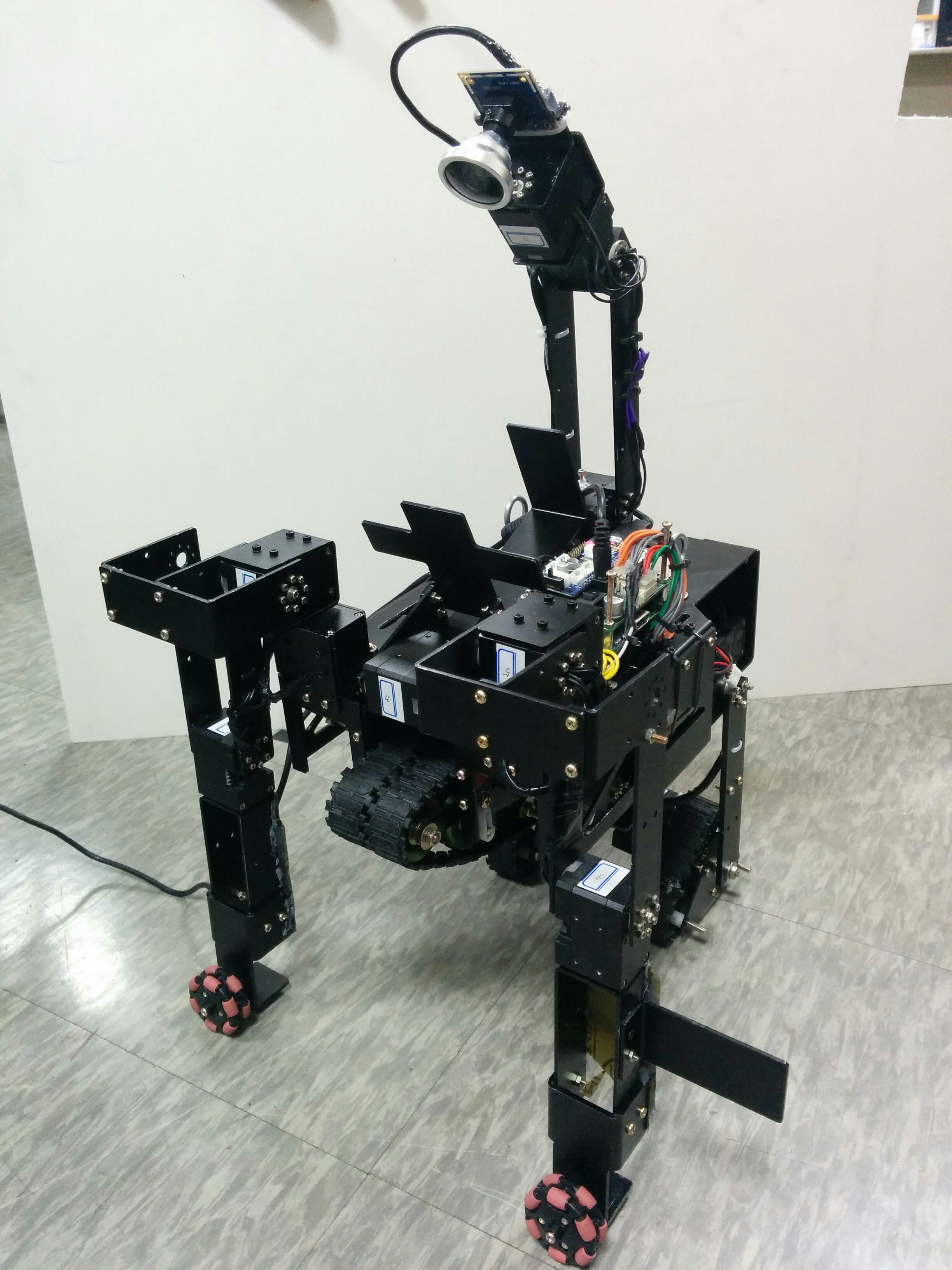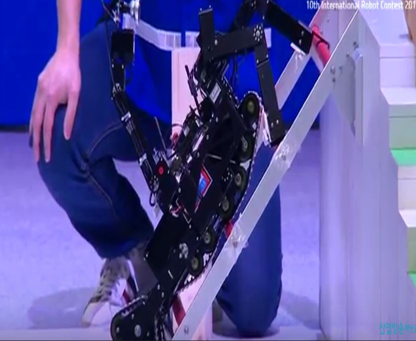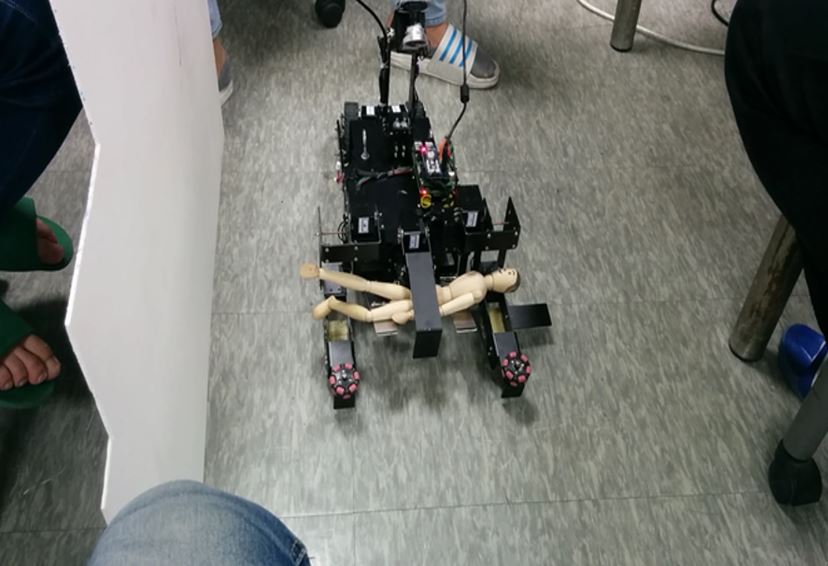 Depending on the terrain, the ROFA can be narrowed down in size or operated while standing up. For safe rescues, the internal structure of the body is designed to unfold using a "hinge" mechanism. This structure, along with two arms, supports the person from the floor, while a cover enhances safety. When climbing a ladder, the caterpillar wheels, arm hooks, and the moment of inertia of the hind legs work together for stability.