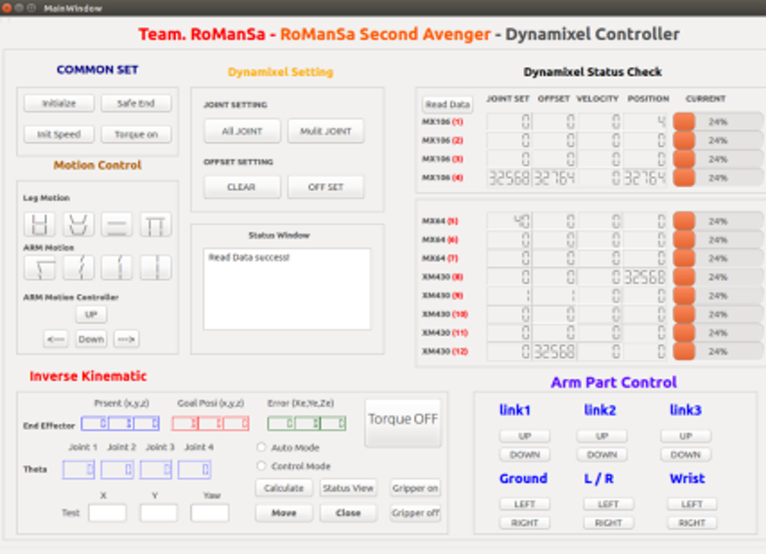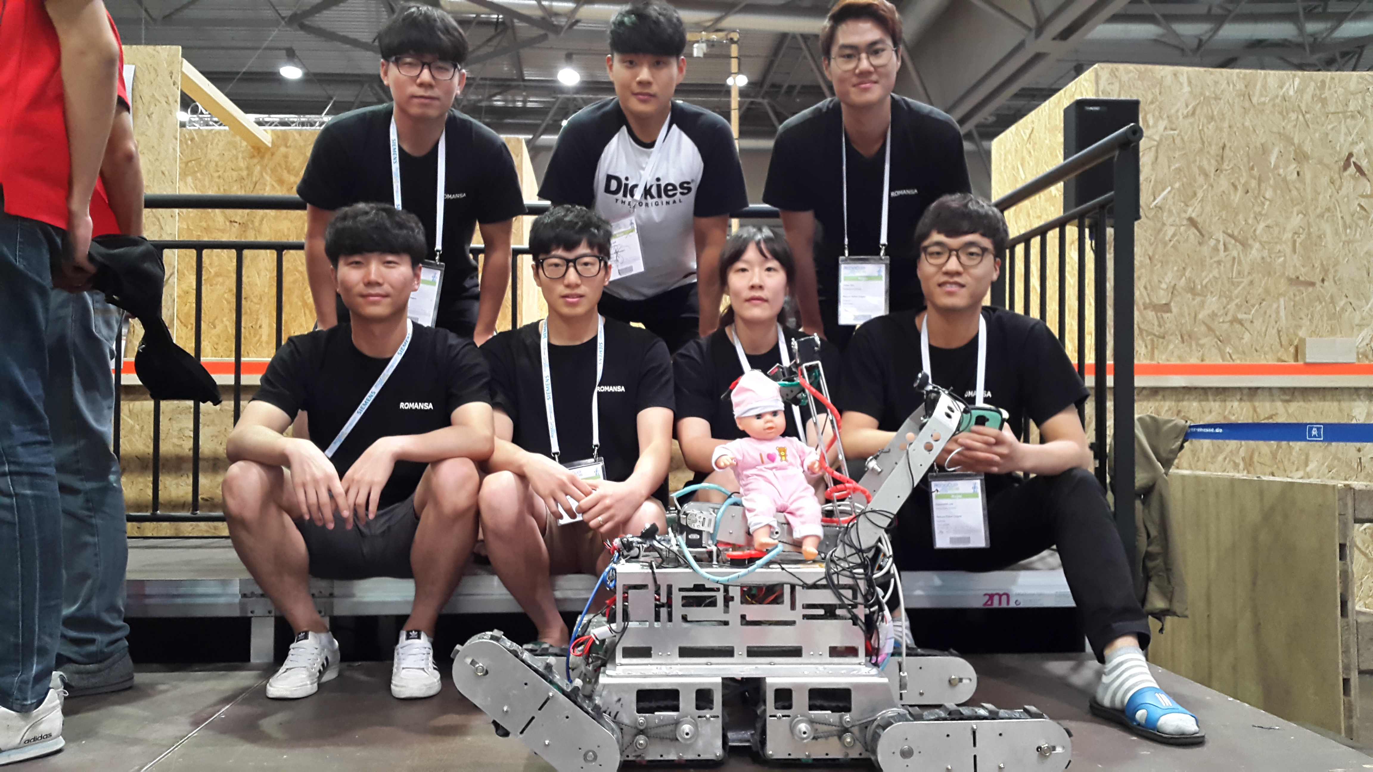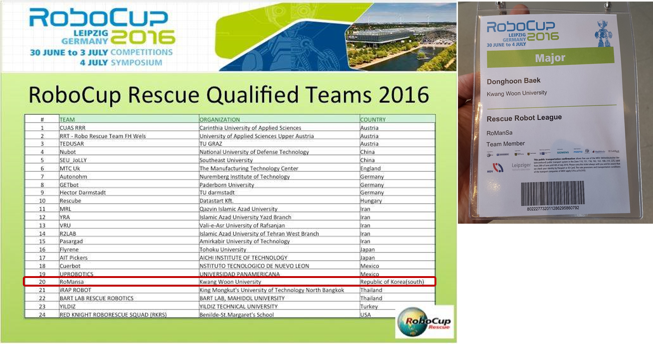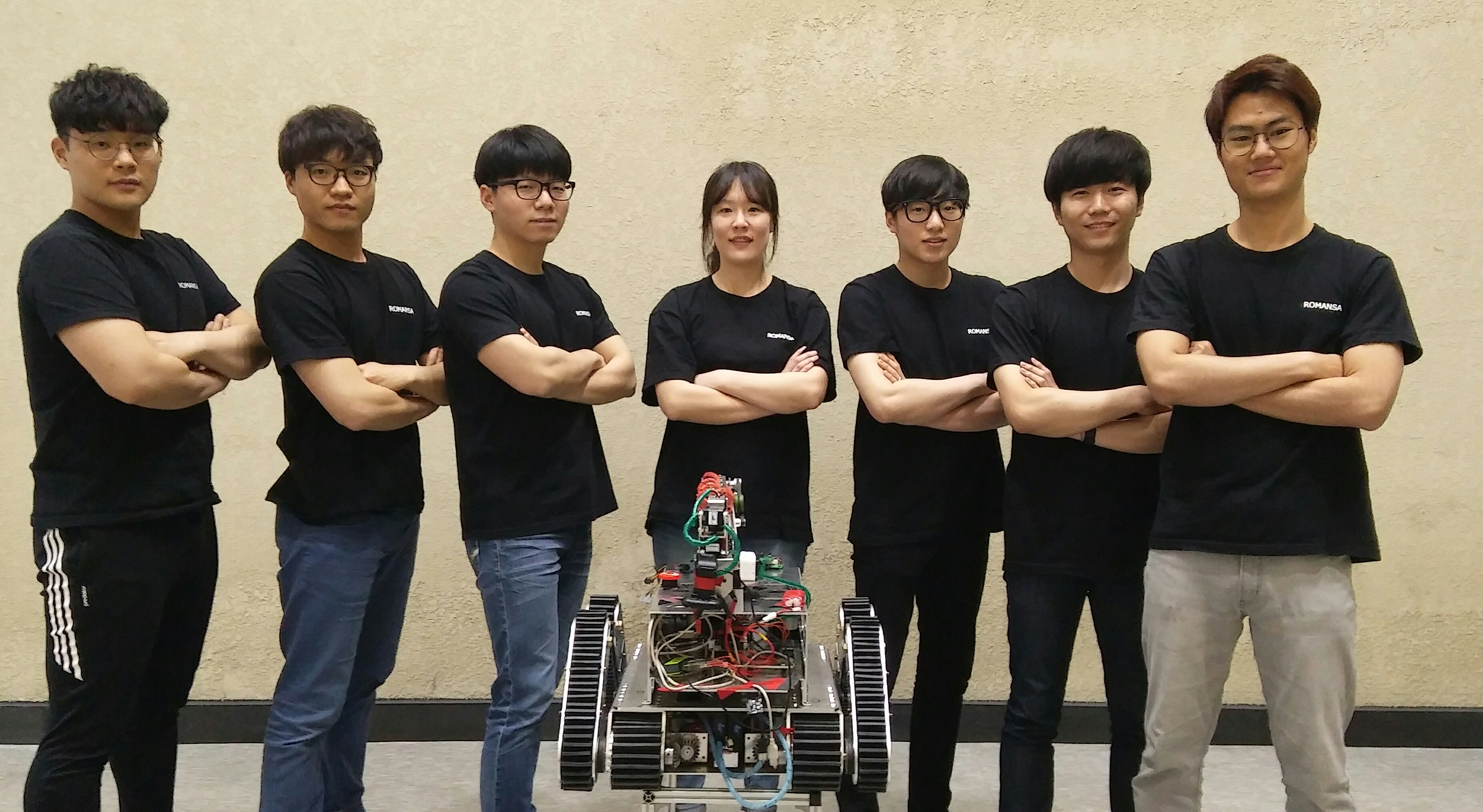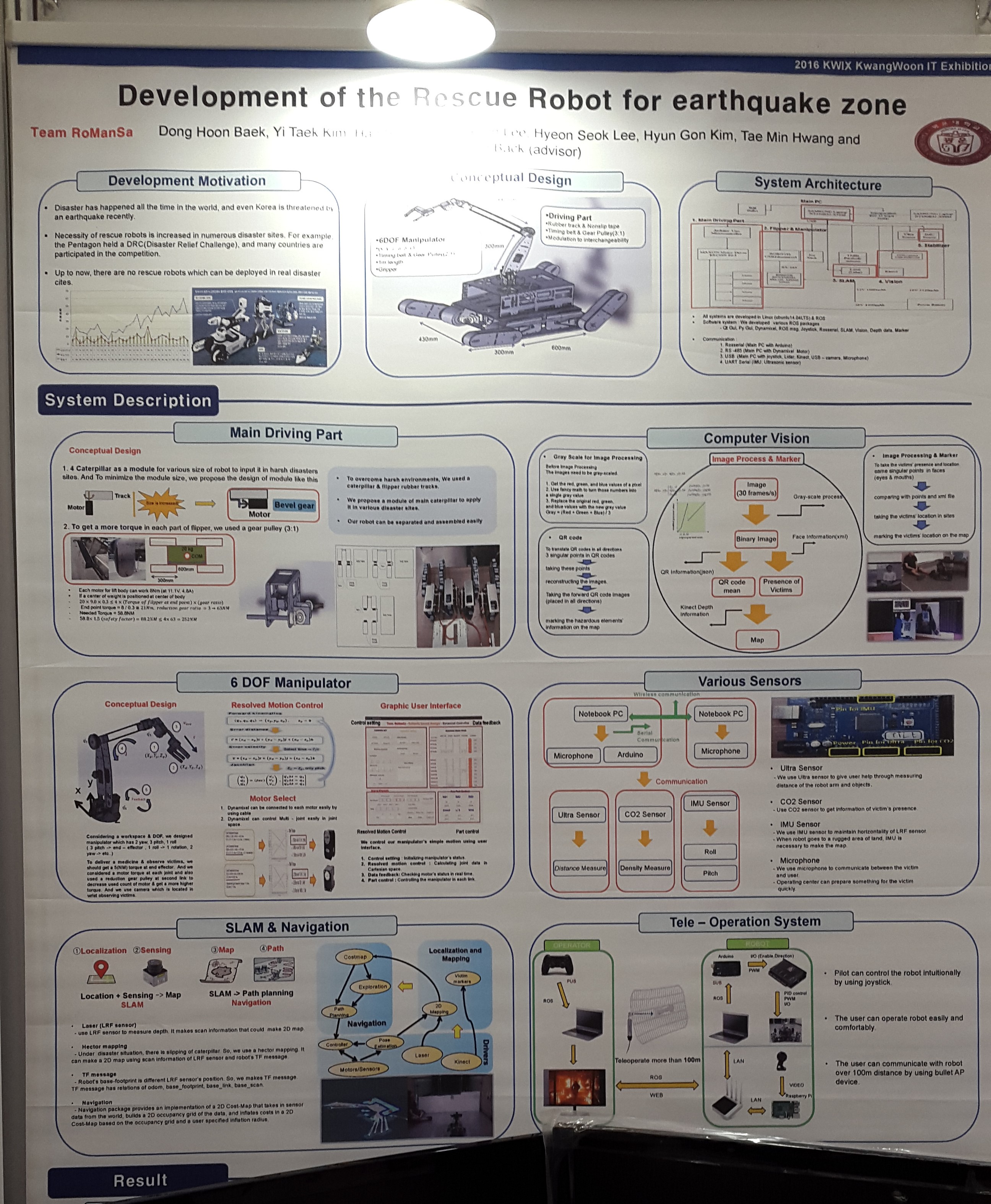 5. My Role: I was primarily responsible for 1) designing and controlling the 6-DOF manipulator, 2) controlling the four legs equipped with caterpillar tracks, and 3) developing the GUI for motor control. After RoboCup, I took on the role of team leader, guiding the team to participate in the IT Challenge at Kwangwoon University and submit an academic paper to the Korea domestic conference (KROC2017). Luckily, we got the best paper award at the academic conference.