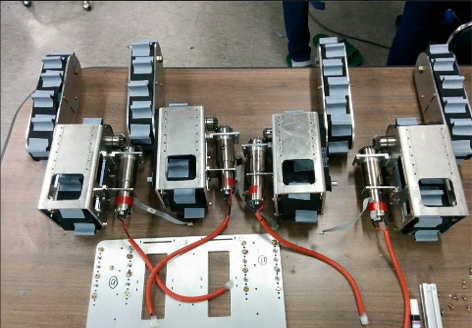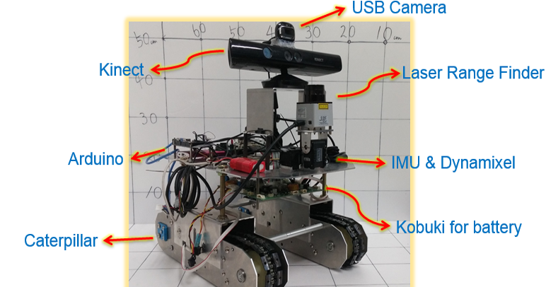 The rescue robot ROSA can climb stairs and traverse uneven terrain. I was in charge of controlling a joint part of four caterpillar wheels.